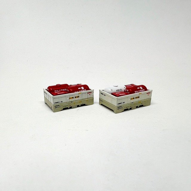UT11A 日本石油輸送 住化ABS ラテックス タンクコンテナを作るキットです。 製品は3Dプリントのレジン出力品ですので、塗装の際はプライマー・サーフェイサー等で下地処理を行って下さい。 塗装はタンク部分は上半分は白色、下半分は青色、フレームは青色、ランボードは銀色です。 塗装後、デカールは個別に切り取り貼り付けしてください。凹凸面に馴染ませるにはマークソフターをお使いいただくと便利です。また貼り付け後はクリアコートをオススメします。 トップコート後組み立てます。タンク部分をにフレームパーツ差し込みます。妻面のフレームに差があります。(下端の斜めのフレームが広い方が取り出し口のある方)向きに注意して下さい。その後ダボに接着剤を着けてフレーム接着します。 コンテナは3Dプリント品故の個体差があります。コキ積載時は「セメダインBBX」のような張って剥がせる接着剤のご利用や両面テープを貼る等の対策を施して下さい。コキ端部の積載は場合によって爪をカットして下さい。キットはコンテナナンバー1種につきコンテナ本体1個とデカール1番号分です。
