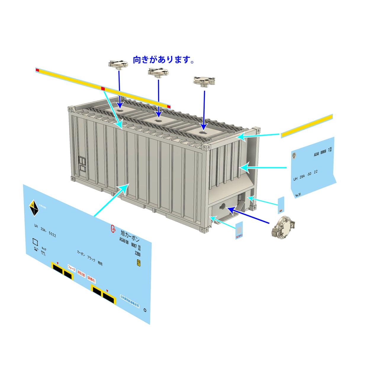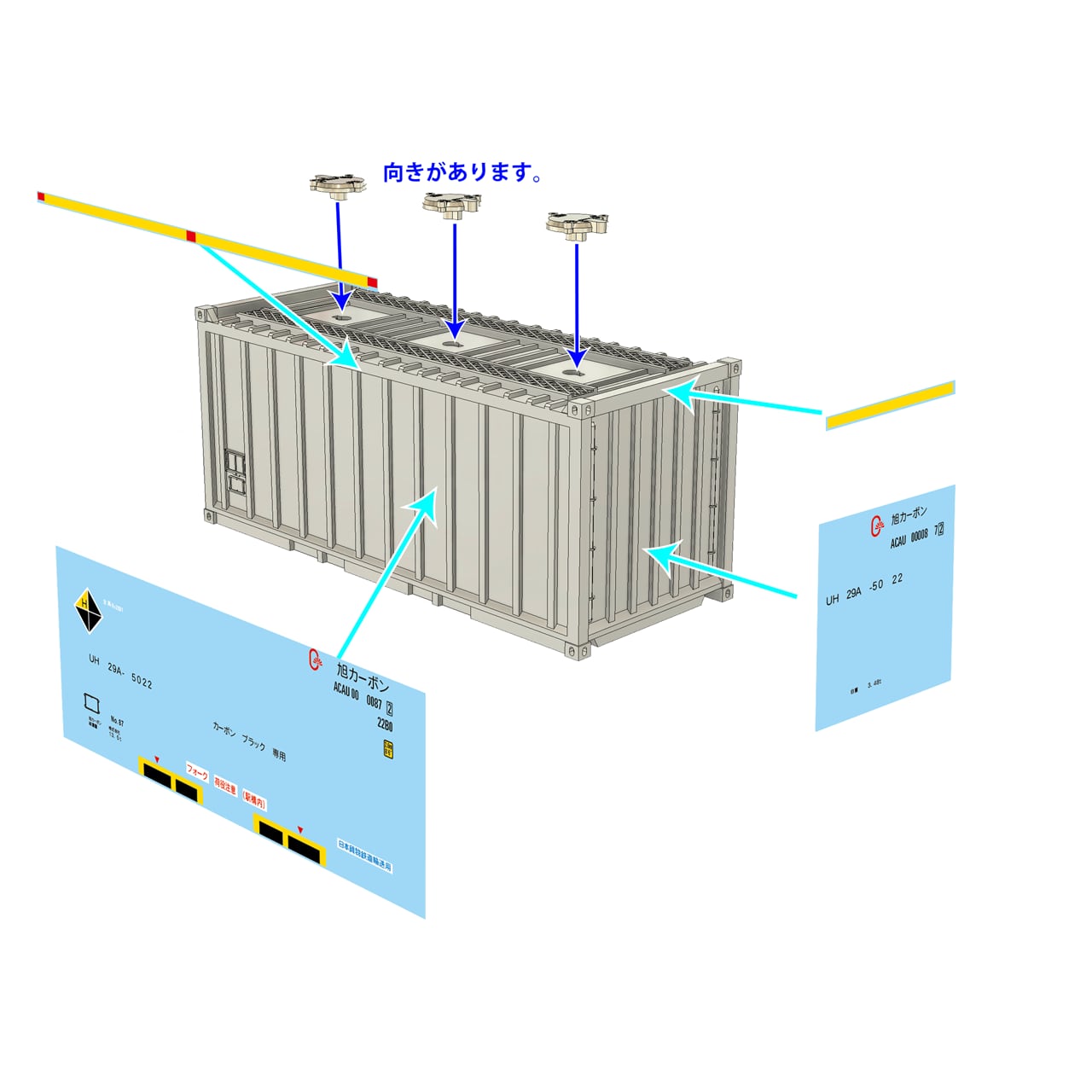 コンテナは無加工で積載可能ですが、3Dプリント品故の個体差があります。コキ積載時に緩い場合などには「セメダインBBX」のような張って剥がせる接着剤のご利用や両面テープを貼る等、工夫して下さい。